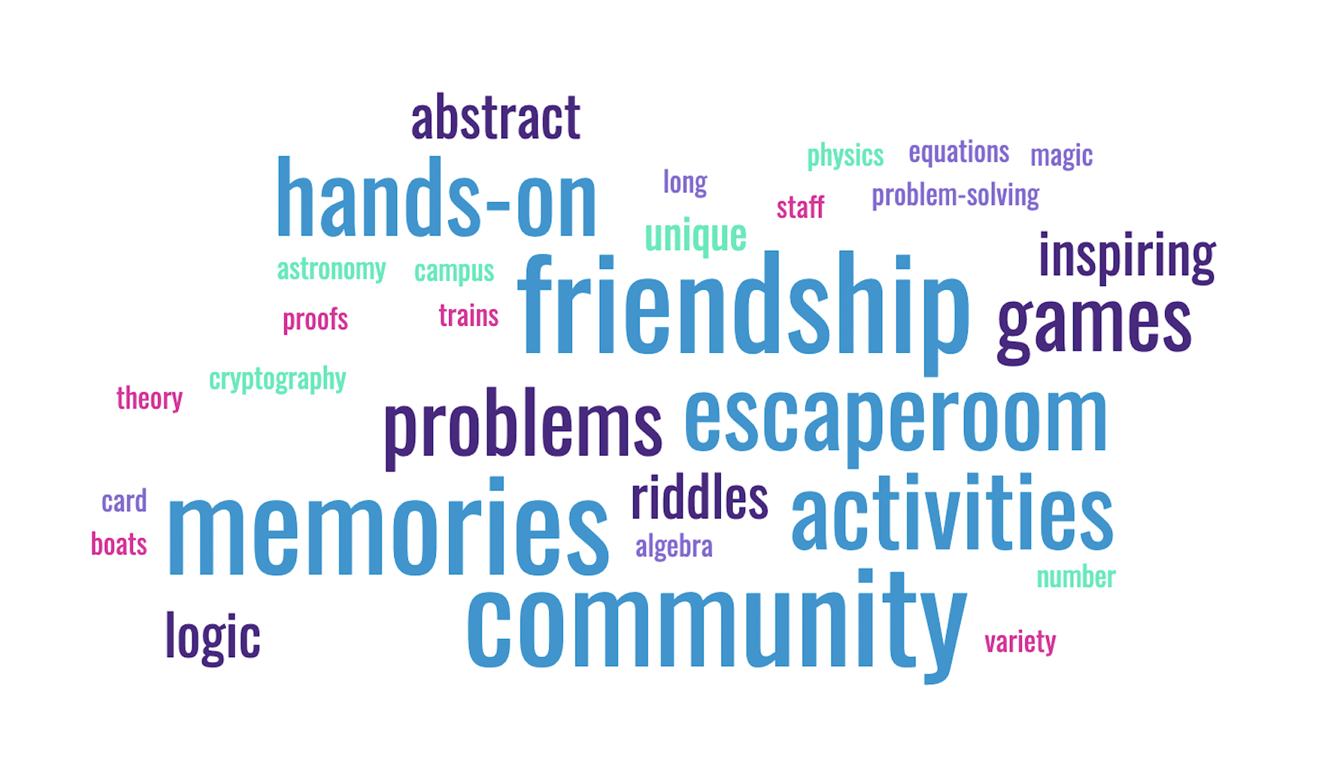 This word cloud was generated using responses to surveys filled out by the campers from summer 2023. A common theme amongst all the surveys was that camp was too short and so much fun. Highlights included the escape room, the games that introduced mathematical concepts, the friendships that were formed during the week and the variety of fun that camp offered. Click below to see some of the work that students were able to accomplish during their time with RabbitMath.